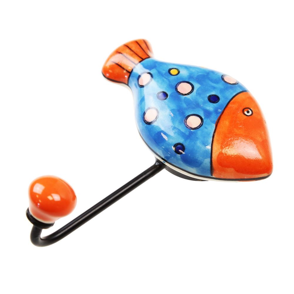 Κεραμικός γάντζος ψάρι σε μπλε και πορτοκαλί αποχρώσεις, ζωγραφισμένος στο χέρι με πουά. Μια παιχνιδιάρικη λεπτομέρεια για μπάνιο ή εξοχικό. Διαστάσεις: 10×13εκ.