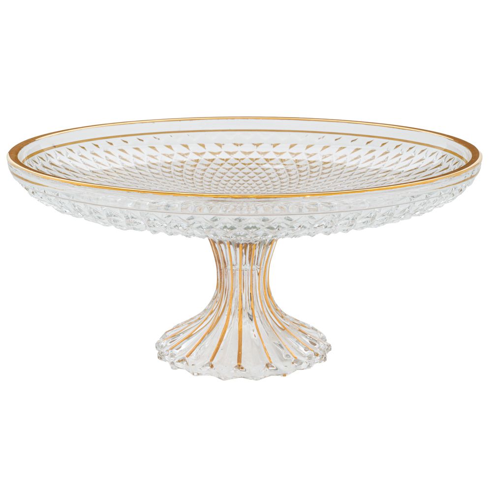 Γυάλινη πιατέλα σερβιρίσματος με πόδι και χρυσή ρίγασ περιμετρικά.