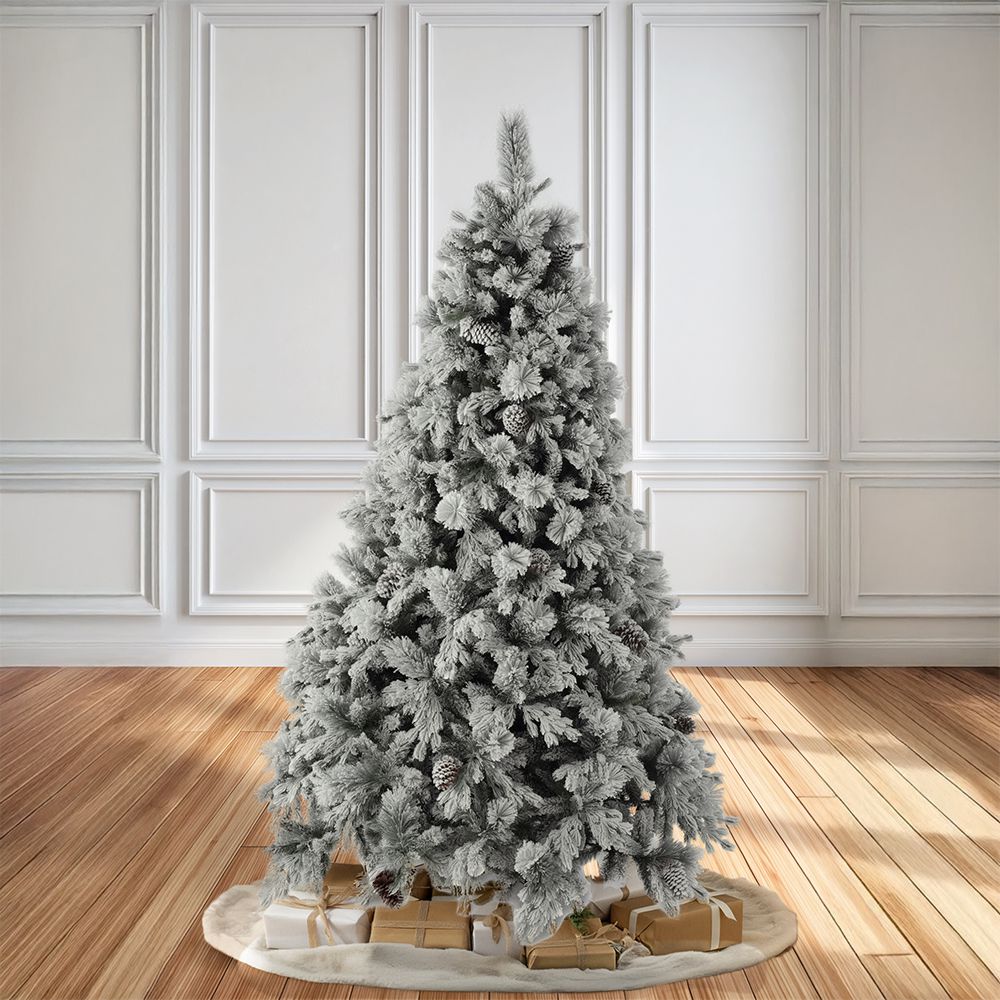 Δένδρο ALASKA χιονισμένο με κουκουνάρια. Υψος 2.10 μέτρα και διάμετρος βάσης 1.42 μέτρα. Υλικό 45% plastic και 55% pvc. Εχει συνολικά 2155 tips. Εύκολη συναρμολόγηση τύπου ομπρέλα και μεταλλική βάση.
