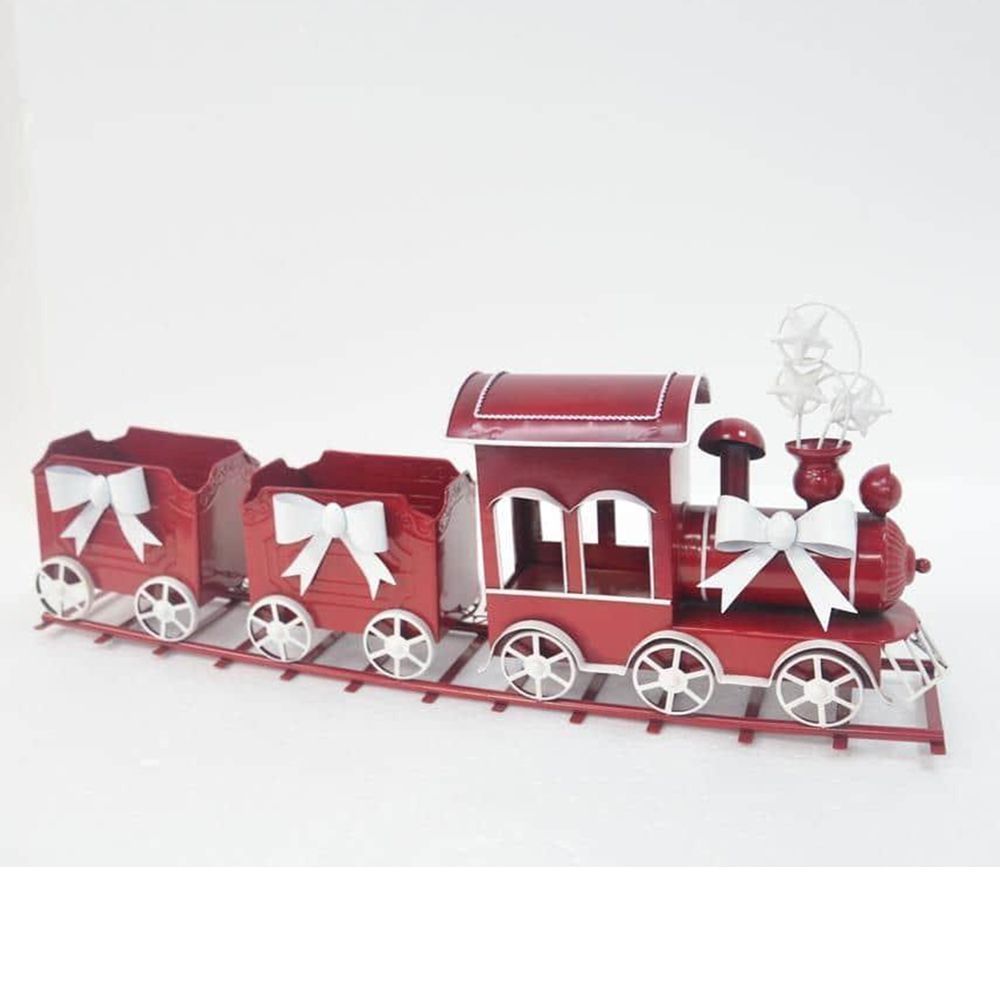 ΚΟΚΚΙΝΟ ΜΕΤΑΛΛΙΚΟ ΤΡΕΝΟ ΣΕ ΡΑΓΕΣ ΜΕ ΔΥΟ ΒΑΓΟΝΙΑ ΚΑΙ ΛΕΥΚΟΥΣ ΦΙΟΓΚΟΥΣ 77Χ15Χ33ΕΚ