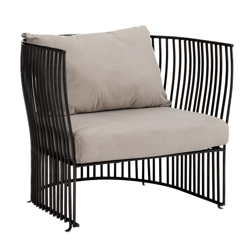 Πολυθρόνα εξωτερικού χώρου με μαύρο μεταλλικό σκελέτο και γκρι μαξιλάρια. Οι διαστάσεις της είναι 74x67x65εκ. και διαθέτει μπράτσα και μαξιλάρια για μεγαλύτερη άνεση. Είναι κατάλληλη για χρήση σε κήπο ή βεράντα.
