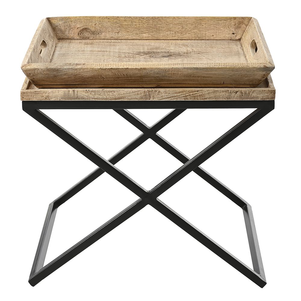 Μεταλλικό σιδερένιο μαύρο τραπέζι διαστάσεων 55Χ45Χ56εκ με ξύλο και αποσπώμενο δίσκο απο μασίφ ξύλο mango. Τα πόδια είναι συμπαγή και δεν ανοιγοκλείνουν. Δεν απαιτεί συναρμολόγηση. Βαριά και συμπαγή κατασκευή .