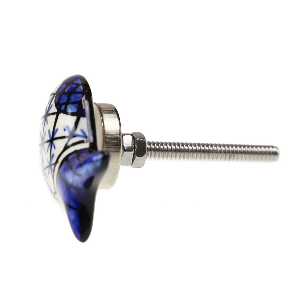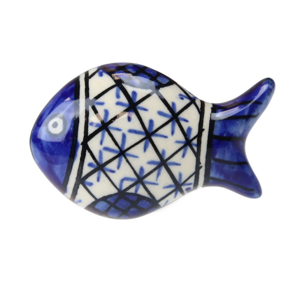 Πόμολο κεραμικό σε σχήμα ψαριού, ζωγραφισμένο στο χέρι σε αποχρώσεις του λευκού και του μπλε, με παραδοσιακό γεωμετρικό σχέδιο. Μια κομψή και παιχνιδιάρικη λεπτομέρεια για κουζίνα ή παραθαλάσσιο σπίτι. Διαστάσεις: 5×3,5εκ.