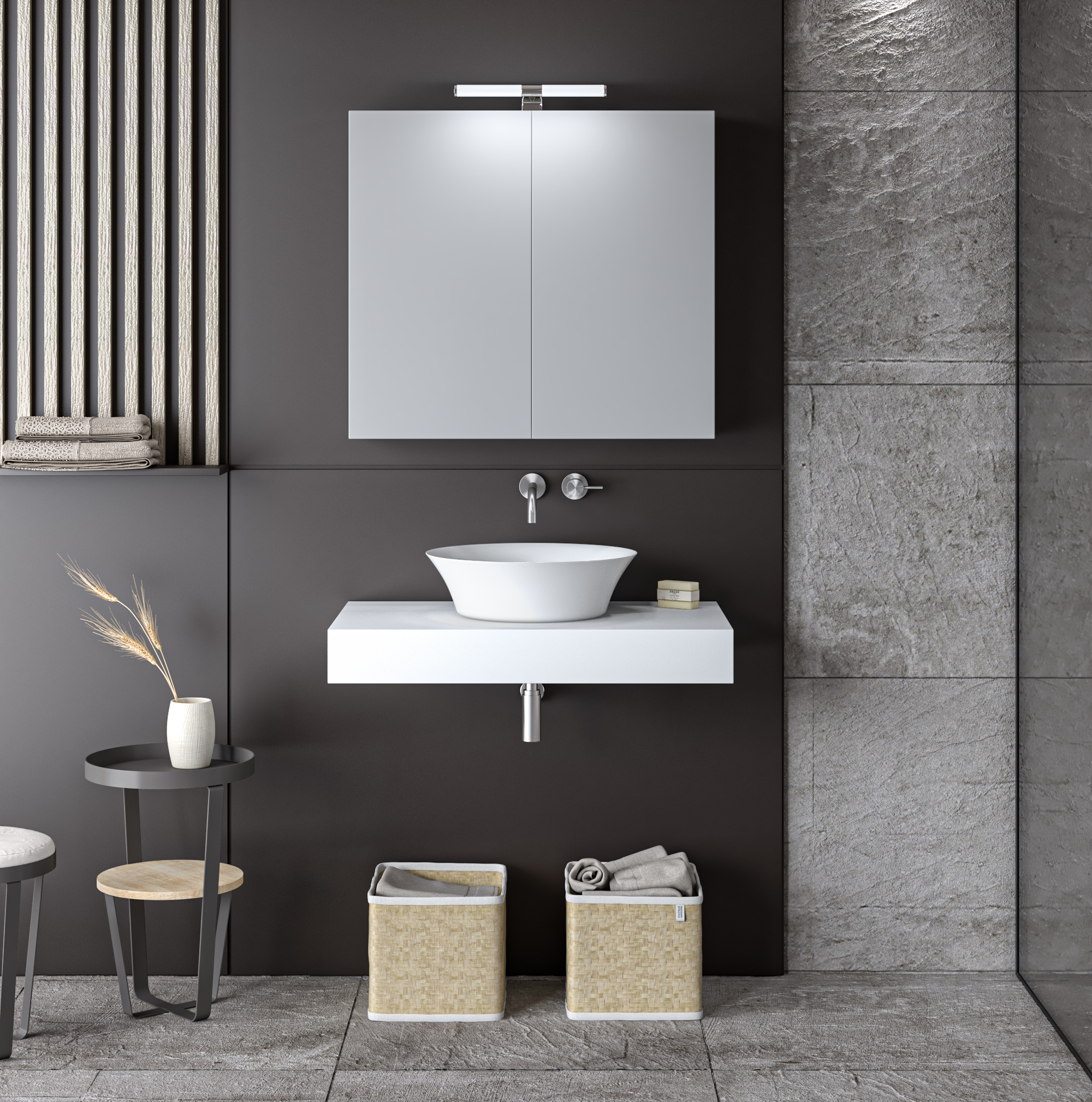ΣΕΤ ΕΠΙΠΛΟΥ STONE 60cm χρ. ΛΕΥΚΟ με γκρι νερά 9SSTO060WH Αποτελείται από: Sintered Stone κρεμαστή βάση για κορυφαία ποιότητα και υψηλή αντοχή και αισθητική. Σκληρό, ανθεκτικό και ελαφρύ υλικό σε χρώμα άσπρο. Διατίθεται ατρύπητο Καθρέφτης OMEGA Λευκό 60 . Περιλαμβάνει πρόσοψη καθρέφτη με δύο πόρτες. Διαθέτει εσωτερικό ράφι για να οργανώνετε καλύτερα την αποθήκευση χρηστικών αντικειμένων καθημερινής χρήσης για όλα τα μέλη της οικογένειάς σας. Νιπτήρα επικαθούμενο πορσελάνης Χαρακτηριστικά: Ετοιμοπαράδοτα προϊόντα Δεν περιλαμβάνει το φωτιστικό, τη μπαταρία, τη στήλη, τα διακοσμητικά κ τη βαλβίδα. Διατίθεται έτοιμο συναρμολογημένο.