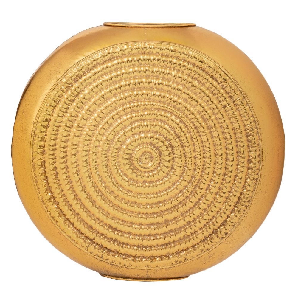Μεταλλικό επιδαπέδιο βάζο με σφυρήλατες λεπτομέρειες σε χρυσό χρώμα.